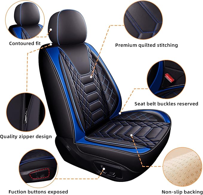 - [Suit For Round Year Use]: Car seat covers front seats only are made of faux leatherette with high rebound sponge, comfortable, and waterproof, anti-scratched, just clean easily with wet towel. Side elastic fabric is stretchable spandex cloth, bottoms are non-slip fabric, prevent seat covers from sliding when getting on and off.