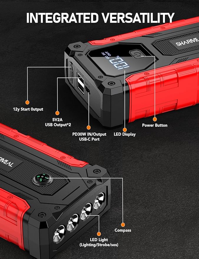 - 【 What You Get】Our Brand is specialized in vehicle emergency starter with 24 months warranty. Sharmeal jump pack (1* jump starter, 1*PD 30W charger block, 1* smart jumper cables, 1* type-C charging cable, 1* user manual, 1* portable carrying case).