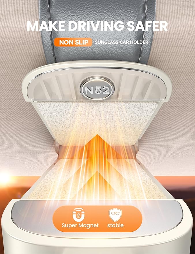 - Rock-Solid Hold (N52 Magnet) – Tested! Durable Car Visor Sunglasses Holder: 2025 upgrade sunglass car holder with industry-leading N52 magnet securely locks sunglasses on visors. Zero slips or drops – even on potholes and after 10,000 test drives