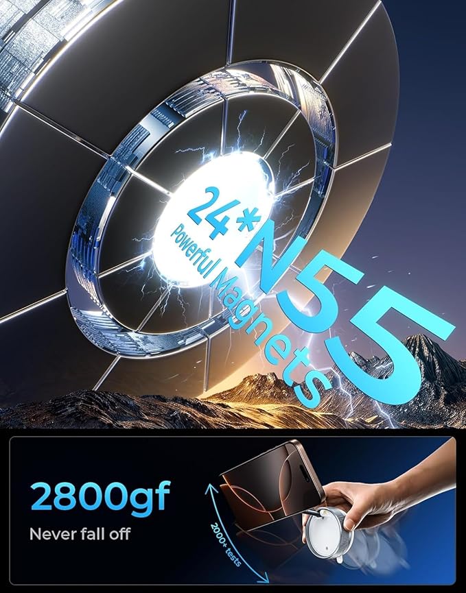 - Ultra Strong Magnetic For Ultimate Stability: This vacuum magnetic phone holder stand is equipped with 24 high-performance N55 magnets that are 240% stronger than standard magnets, providing up to 2800gf of magnetic force. After passing 6000 vibration tests and extreme road simulations, you can rest assured that your phone will stay firmly in place even under severe conditions.